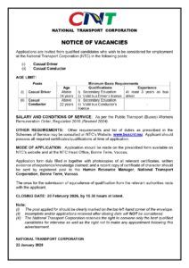 Applications are invited from qualified candidates who wish to be considered for employment at the National Transport Corporation (NTC) in the following posts: