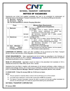 Applications are invited from qualified candidates who wish to be considered for employment on permanent basis at the National Transport Corporation (NTC) in the following NRB governed posts: